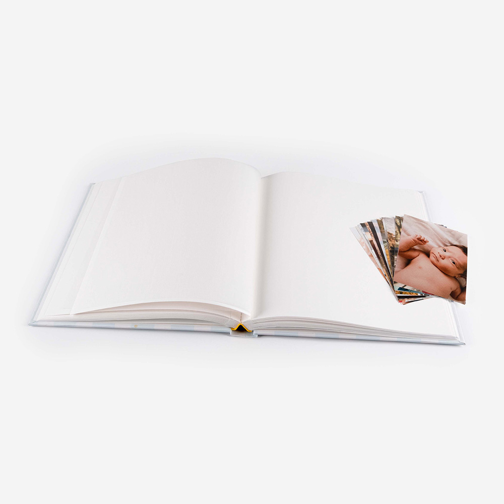 Álbum de cartão resistente, com folhas em branco.