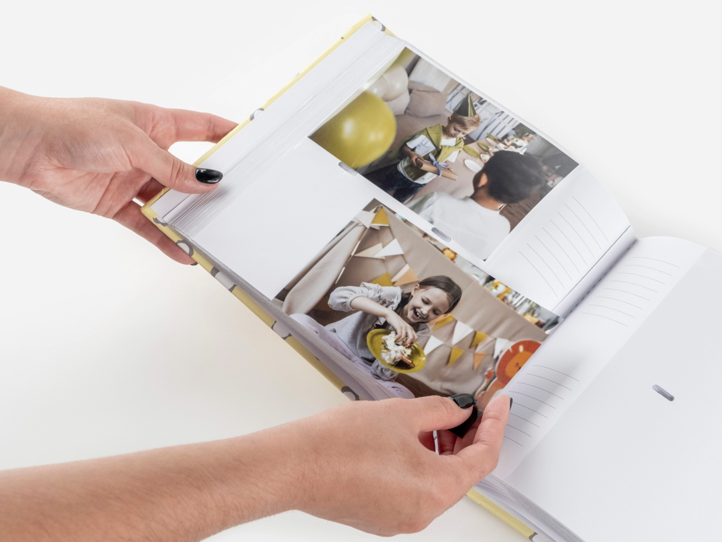 Álbum de cartão resistente, com folhas em branco. Estas possuem linhas para que possas escrever mensagens ao lado das tuas fotografias.